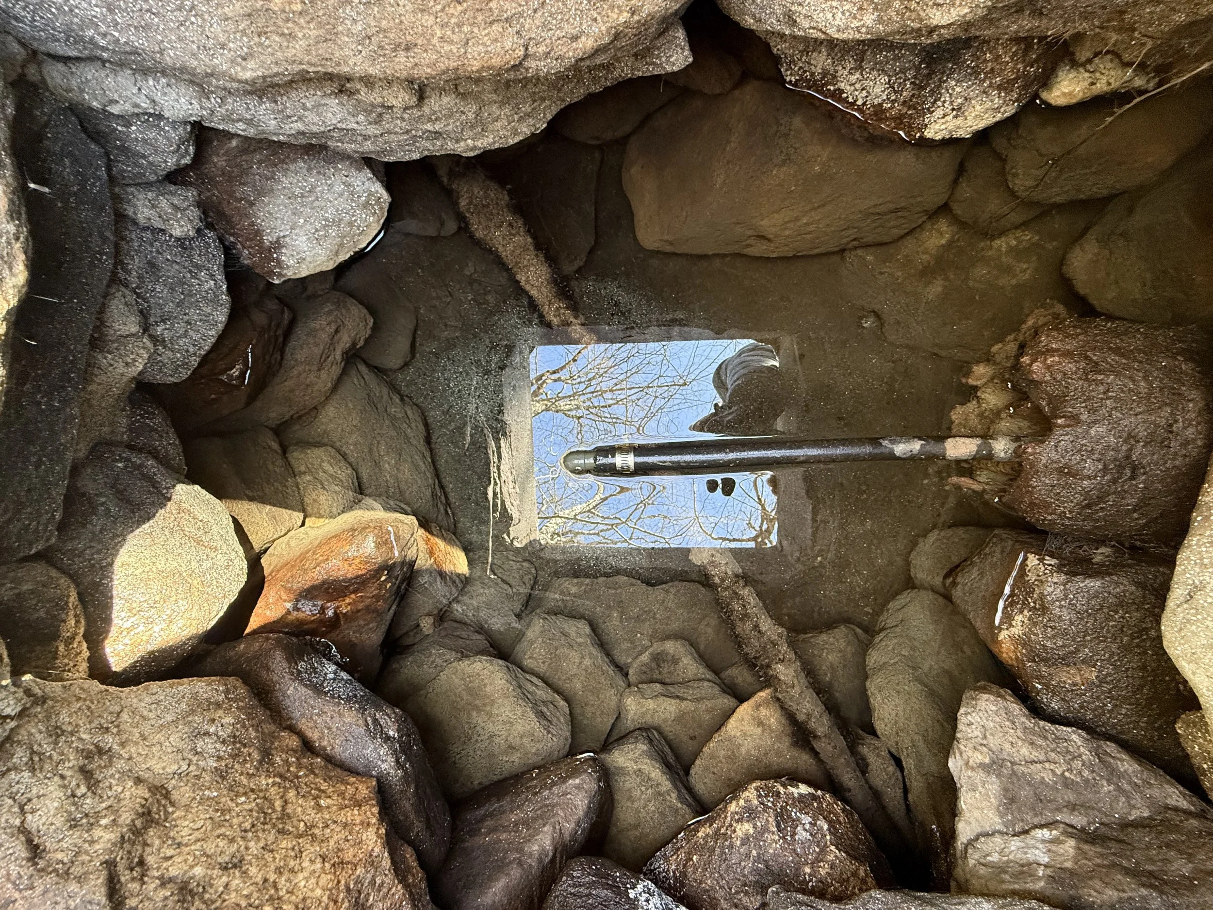 Looking into spring box showing supply line to house. When house is at-capacity, excess water naturally percolates out the log pip holding the supply line and into the surround in soil.