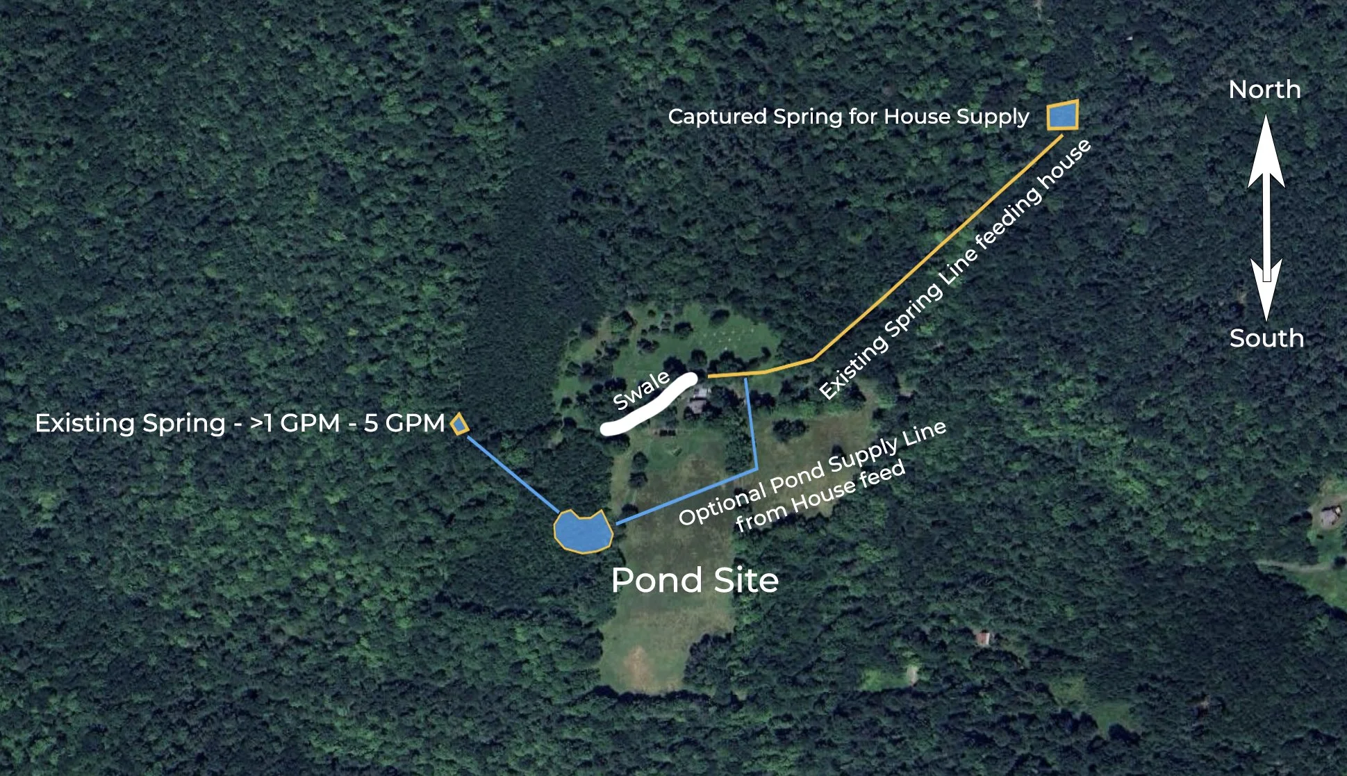 The spring to the West is semi captured and flowing through a pipe and mostly captured by a retaining pool below the spring (see photo/video below) it produces 5 GPM + this time of year, and in the middle of the drought last year, >1 GPM but still produced. I am going to redirect it from the retaining pool down to the pond site, which is about a 20’ drop in elevation through a 1 inch pipe.